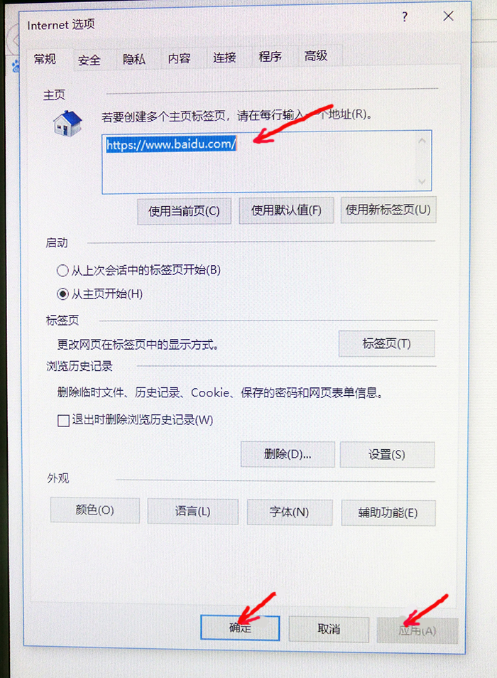 1、打开现有页面“internet选项”,在“主页”栏中输入你所喜欢的其它网址(如https://www.baidu.com/)后点击“应用”和“确定”。↓