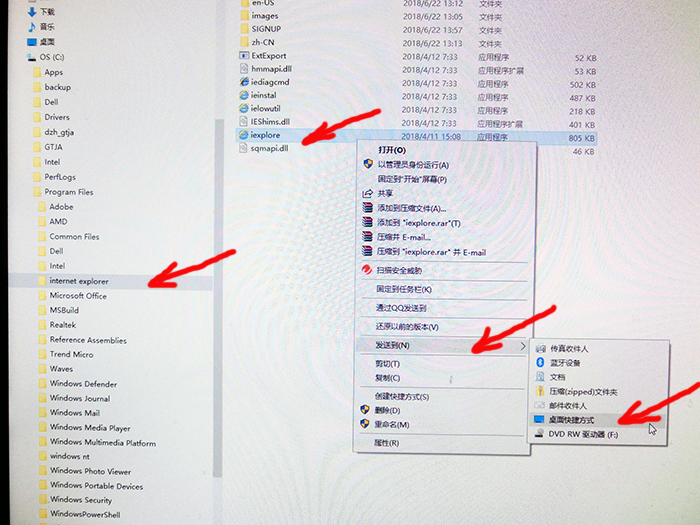 4、用鼠标右键点击iexplore.exe,在弹出竖菜单中选择“发送到”,再选择“桌面快捷方式”; ↓