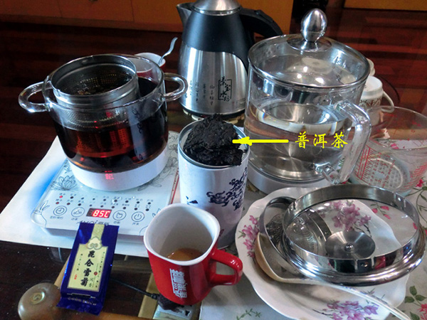 然而,我对洗茶还有另一番见解。即,针对保健或治疗的需要,许多人在喝茶时还常添加一些中药类物质,比如本人也常用以下二个配方:一个是针对自己经常出现口干舌燥、眼花的症状,在泡普洱茶时常添加适量陈皮、甘草和枸杞。另一个是针对我爱人皮肤常患湿症的情况,女儿曾推荐在普洱茶中添加适量的陈皮和茯苓(点击《制作“九蒸九晒陈皮”攻略 养好你的脾胃》可浏览配方),经过饮用证明,这二个配方都很有疗效的。但是,为了有效清洗掉中药表面的农药或污物,不能像洗普洱茶那样太快速,应该提前对这些中药材稍长时间的浸泡,我的做法是,先在热水(80℃左右)中搅拌清洗一分钟左右,再与普洱茶一起应用“快速洗茶法”进行泡茶,这样,既尽量保留了普洱茶中的有效成分,又不更多损失中药材的药效,因为相对普洱茶,中药材的抗泡能力要强,其内在药性还真需要较长时的浸泡才能有效发挥。只有这样做,我才感觉更加心安些。