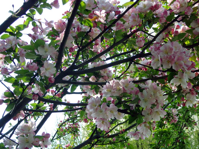 我家附近小区院里有几株西府海棠树,五月,正是海棠花盛开的时候。当清晨雾气未散的时候,我徜徉在树下,品赏胭红点点的花蕾,嗅闻沁人心脾的幽香,陶醉在粉红娇柔的花枝丛下。