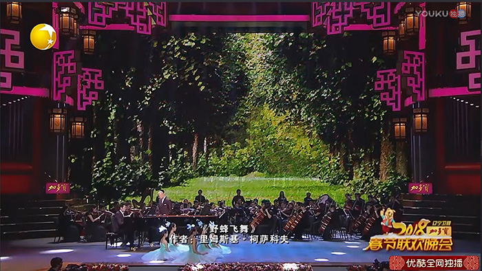 第一层次:当朗朗与庞大交响乐队合作演奏表达四季风情的世界著名乐曲(下图标有四首乐曲名称)时,来自辽芭等剧院许多位著名演员登台表演精彩的民族舞、独舞和芭蕾舞,同时舞台背景屏幕采用现代光电技术不断显现四季的美丽风光,让观众通过聆听和观赏高水准的艺术表演,可以讲这种美的综合享受非常的难得,甚至去国外有名气的舞台也看不到的。