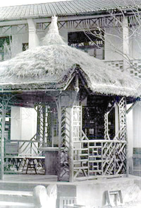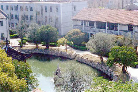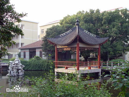 石子路前方正对礼堂大门,礼堂里面办理入学手续,班主任老师把我们领到教室里。走出礼堂大门一拐弯,一汪清澈湖水映入眼底,湖的周围栽有垂柳,湖心三曲木桥直通湖心亭,湖心亭为木质结构,顶棚四角呈飞檐形,亭上高挂题名“仰高亭”的牌匾,以后才知道是老校长丁仁科的手迹。走近湖边石栏观望,一簇簇荷花绿盖擎天,一群群金鱼碧水嬉戏,一只只蜻蜓在湖面穿梭,湖南边的二层教学楼和楼北面的草顶芳菔亭、湖西边的图书馆红楼、湖北部的小学部教学楼以及通道上方葡萄架的翠绿齐刹刹倒映在湖水里,映成一幅仙景般的画卷,美不胜收。进校第一天给我留下的印象如此之深,至今也没有淡忘。