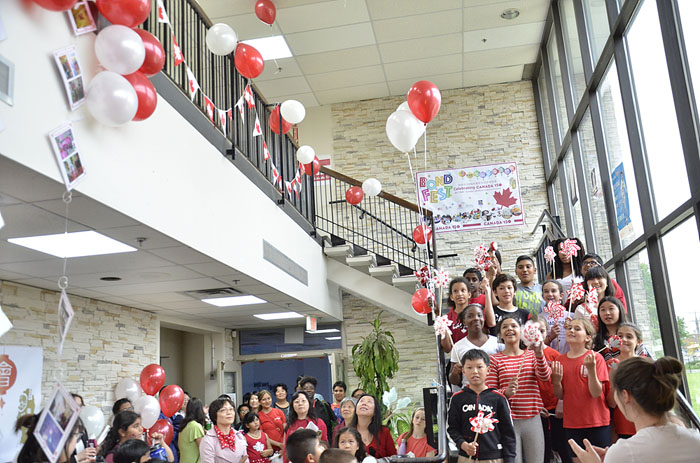 傍晚6点,在邦德音乐老师Laura Harvey女士的指挥下,参与国庆公益演唱的邦德学校少儿合唱团用英文、法文领唱加拿大国歌《O Canada》,正式启幕本次庆祝加拿大150国庆嘉年华亲子欢乐夜。独家冠名赞助RBC皇家银行代表、社区经理林嘉华先生,安省国际贸易厅长陈国治先生,主办机构安大略-江苏友好协会会长李宁玉博士代表、邦德学校校长John Healey先生,场地赞助代表、邦德多伦多国际学院副校长Phil Davies先生,齐聚大厅,为本次活动致辞,并放飞红白气球,为活动剪彩,与来自大多伦多地区的各族裔家长和孩子们同庆2017多伦多秦淮灯会-加拿大150国庆嘉年华亲子欢乐夜。