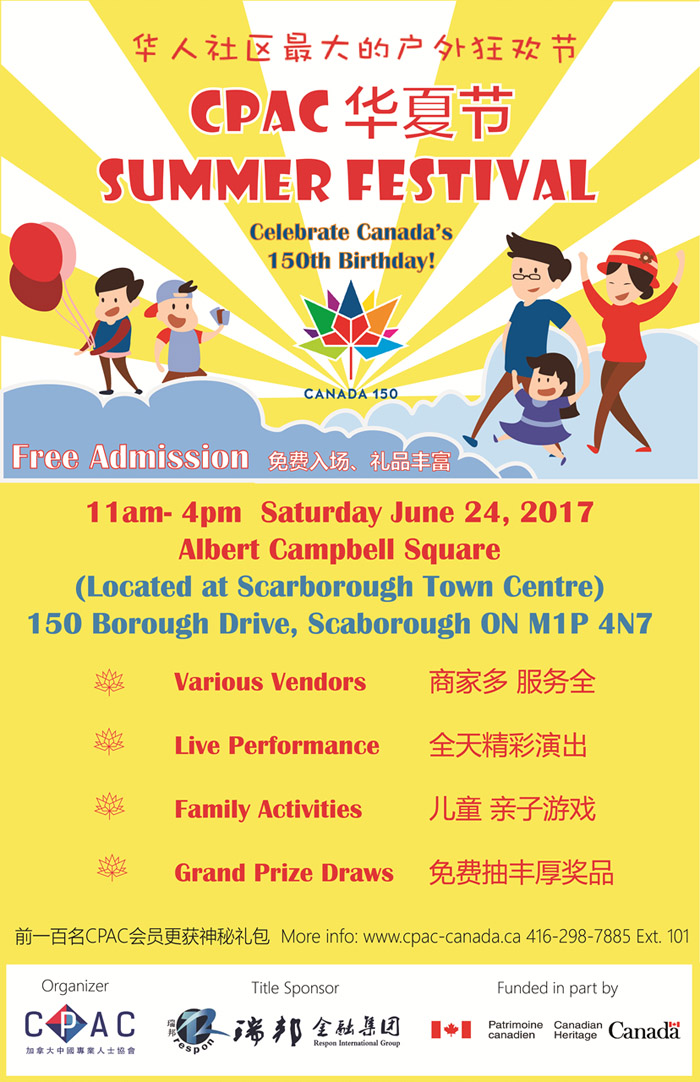 华人社区最大的户外狂欢节,CPAC华夏节又将在本月隆重登场。6月24日星期六带上您的家人和朋友,来 Albert Campbell Square (士嘉堡市政厅门前广场),吃喝玩乐、领礼品、赢豪礼,一起庆祝加拿大建国150周年,这是属于我们自己的年度大party!