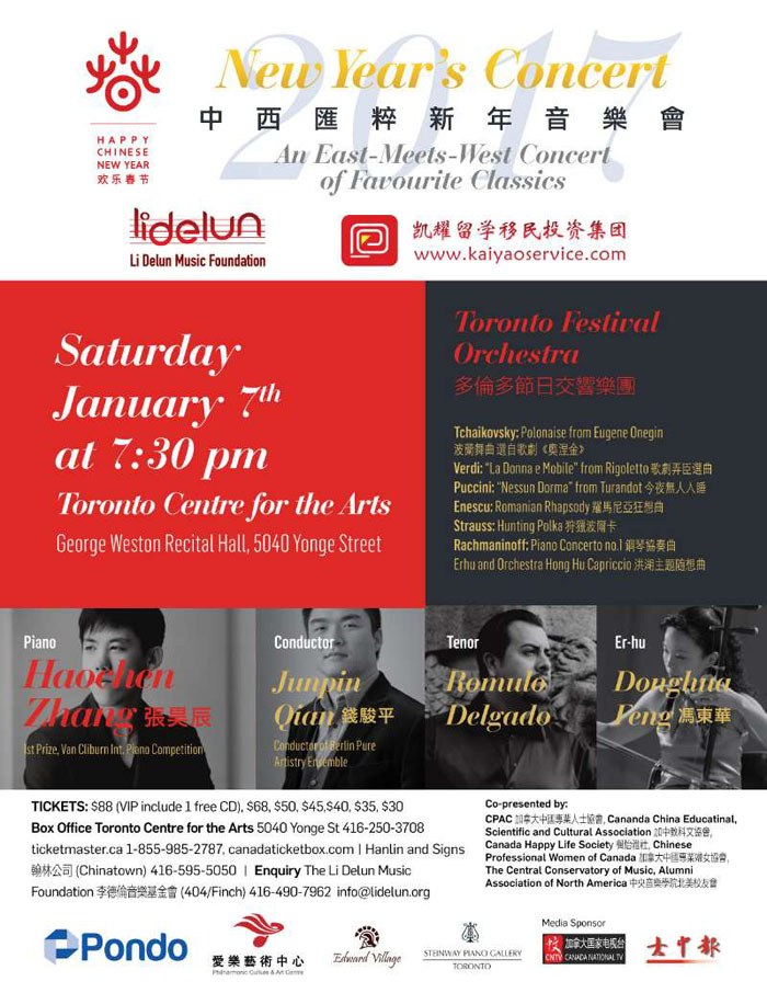 2017中西汇粹新年音乐会定于2017年1月7日晚7:30时在George Weston Recital Hall, Toronto Centre for the Arts, 5040 Yonge Street 举办。票价: $88 (VIP送一中国著名钢琴家演奏CD), $68,$50, $45, $40, $35, $30,