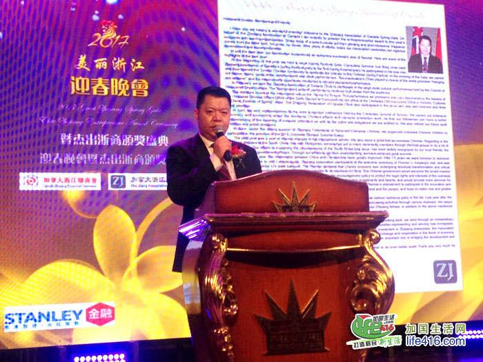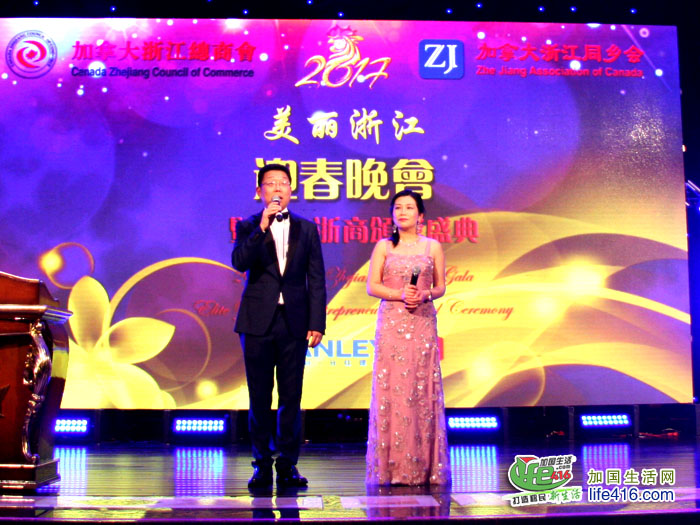 【加国生活网】为庆祝中国传统的鸡年, 由加拿大浙江同乡会与加拿大浙江总商会两大社团共同举办,并由Stanley金融提供独家主题赞助的2017美丽浙江迎春晚会暨杰出浙商年度颁奖仪式于2017年3月5日在多伦多成功举办。加拿大总理杜鲁多专门发来贺信以示祝贺。加拿大三级政府官员, 中国驻加拿大使领馆官员,本地多家社团和机构的代表及浙江乡亲600多人云集钓鱼台国宴,共同见证了这一精彩瞬间。