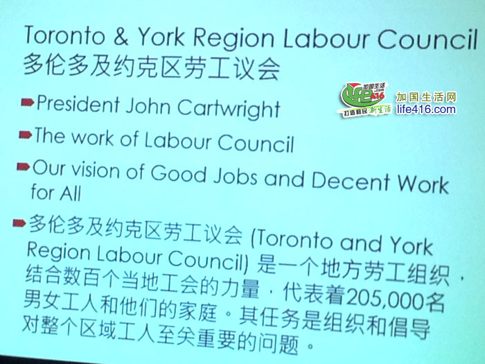 劳工议会在现场还着重介绍了华工网络(Chinese Workers Network),华工网络成立于2012年,隶属于多伦多及约克区劳工议会,成员大部份来自自愿参加的工会会员,他们致力: