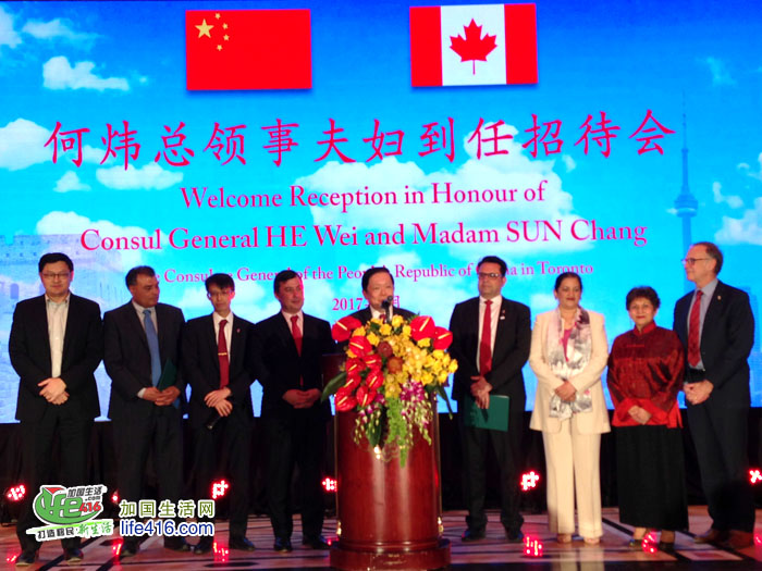 【加国生活网】中国驻多伦多总领事何炜和夫人孙畅于2017年4月14日举行到任招待会。加拿大联邦参议员胡子修,联邦众议员庄文浩、陈家诺、谭耕、马万里(Majid Jowhari)、扎西德(Salma Zahid)、奥利芬特(Robert Oliphant)、拉坦西(Yasmin Ratansi)、陈圣源、蔡报国(Bob Saroya),安大略省议会反对党领袖彭建邦(Patrick Brown)、省议员董晗鹏、赵成俊(Raymond Cho)、科埃(Lorne Coe),万锦市市长薛家平(Frank Scarpitti)、列治文山市市长巴罗(Dave Barrow)和大多伦多地区多位区市议员等加三级政府代表,俄罗斯、韩国、日本、缅甸、柬埔寨、乌干达等国驻多伦多领团代表,以及多伦多华人团体联合总会主席林性勇等华侨华人、中资机构、留学生等各界人士近千人出席。