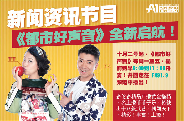 今天,菲菲要在这儿宣布一件大事!十月二号开始,《都市好声音》要改版播出啦!由现在的中午11:00到1:00,改为每周一至五,上午9:00到11:00播出!