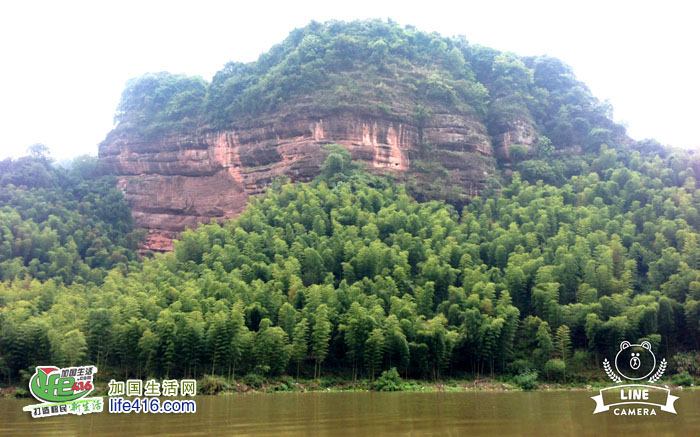 拐弯处就来到一大片水域,原来飞天山景区是集丹霞地貌,溶洞、碧水,温泉于一体的地方,青山、绿水、红崖赤壁、竹林深深,构成一幅雄、奇、险、秀,美仑美奂的自然画卷。