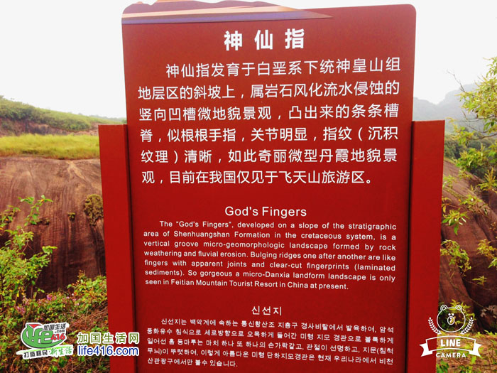 还有一处景点叫“神仙指”,发育于白垩系下统神皇山组地层区的斜坡上,属岩石风化流水侵蚀的竖向凹槽微地貌景观,凸出来的条条槽槽,似神仙的根根手指,关节明显,指纹(沉积纹理)清晰,如此绮丽微型丹霞地貌景观,目前仅见于中国湖南省郴州的飞天山旅游景区。