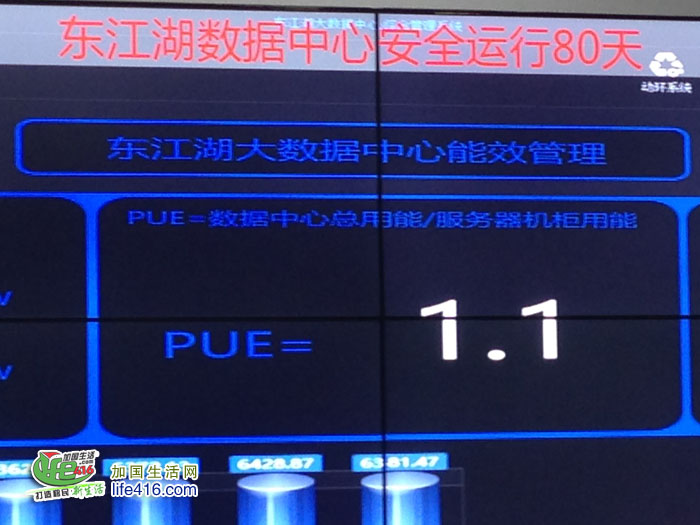 众所周知,电脑一打开就会发热,而让500万台服务器24x7同时不间断工作的话,耗电和散热都是大问题。大数据中心则拥有一套自主设计的致冷系统,由于东江湖湖面面积160平方公里,蓄水量81.2亿立方米,每年至少有15亿立方米、常年保持在5-13℃的冷水流经东江湾,大数据中心就利用这个优质的冷水资源来制冷,不仅解决了散热问题,还能节约用电50亿度,其PUE值能常年稳定在1.2以下,成为全国最环保的大数据中心。