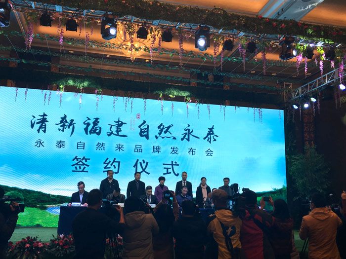 在当天的发布会上,上海景域营销总经理、景域旅游智慧经济集团集团副总裁夏晗对永泰打造全新旅游品牌的内容进行讲解,介绍了永泰旅游品牌LOGO、永泰旅游口号以及永泰旅游三年战略。同时,发布会对青云山、云顶、天门山、百漈沟景区、嵩口古镇等永泰旅游资源进行了招商推介,北京巅峰文旅旅游发展有限公司、乾景园林股份有限公司、福州优空间商业管理有限公司与永泰县政府现场签约。最后,福州市人民政府副市长李春、福州市旅发委副主任杨云华、中共永泰县县委书记陈斌、县长雷连鸣、县人大常委会主任王德冠、县委副书记林从宇六位领导一起上台触摸屏幕,拉开了永泰县打造全新旅游品牌的帷幕。