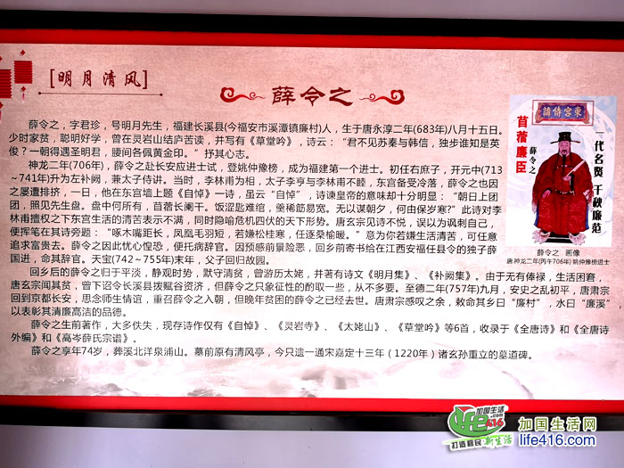 廉村原名富溪津、石矶津,南朝梁天监年间(502—519),光禄大夫薛贺由江南迁入福建,辗转定居于石矶津。他的第六代孙薛令之勤奋读书,在唐神龙二年(706 年)终成为八闽第一位进士,及第后授官左补阙、太子侍讲。时宰相李林甫弄权,东宫官受冷遇,薛令之秉性刚直清正,愤懑不平,对朝政日非、腐败日盛进行讽刺,题《自悼》诗于墙上曰:“朝日上团团,照见先生盘。盘中何所有,苜蓿长阑干。饭涩匙难绾,羹稀箸易宽。只可谋朝夕 , 何由度岁寒?”表示对唐玄宗做法的不满。