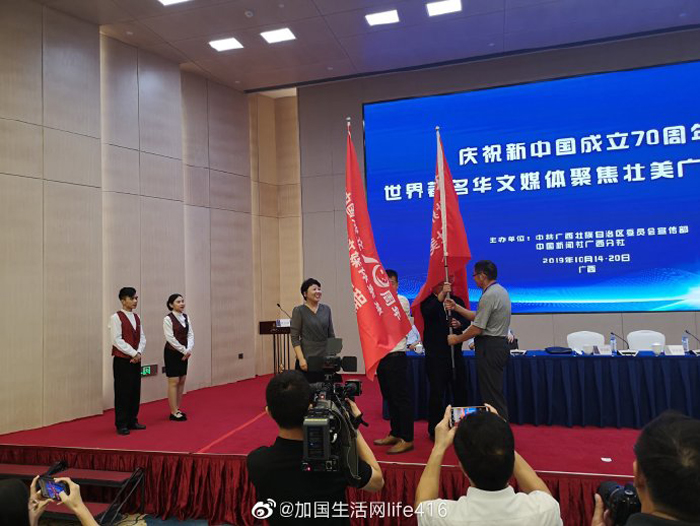 【加国生活网】五洲华媒聚八桂,广西故事成焦点。“庆祝新中国成立70周年·世界华文媒体聚焦壮美广西新征程”活动于2019年10月15日在南宁启动,来自世界五大洲19个国家和地区的42家媒体将零距离感受广西日新月异的新变化。广西壮族自治区党委常委、宣传部部长范晓莉和中国新闻社副总编辑张明新出席启动仪式,致辞并为采访团授旗。