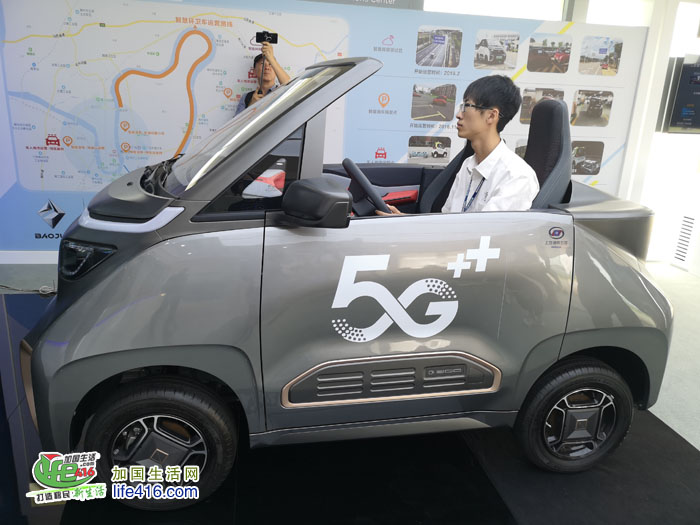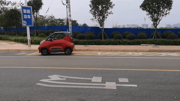 (此图为动画GIF,下载需要些时间)工作人员和小编说:咱们试试“招车”。小编问:啥叫招车。工作人员说:招车就是一招手,你的车就自己开到你面前……说完,工作人员一按手机,这辆红色的小E就自己开到我们面前,无人驾驶哟!