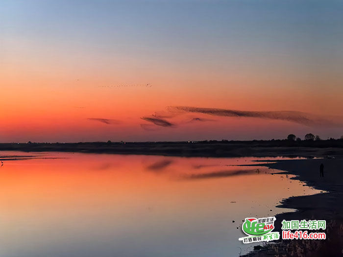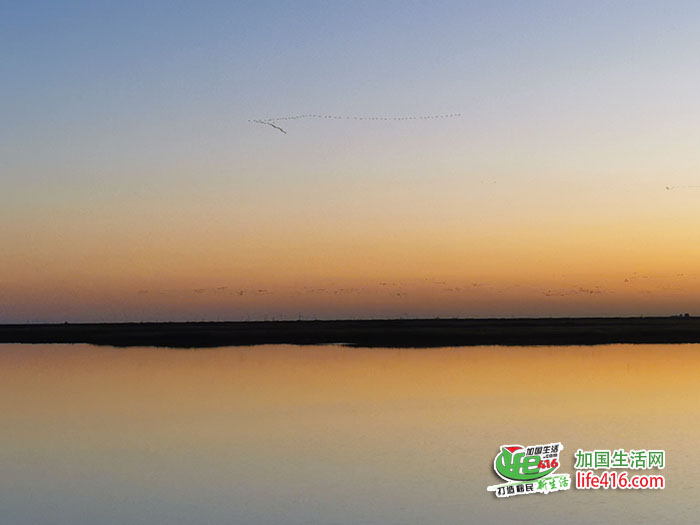 随着太阳渐渐下山,夕阳的颜色也在不断变化中,天边陆续飞来变幻着各种队形的鸟群,但这些都不是“鸟浪”