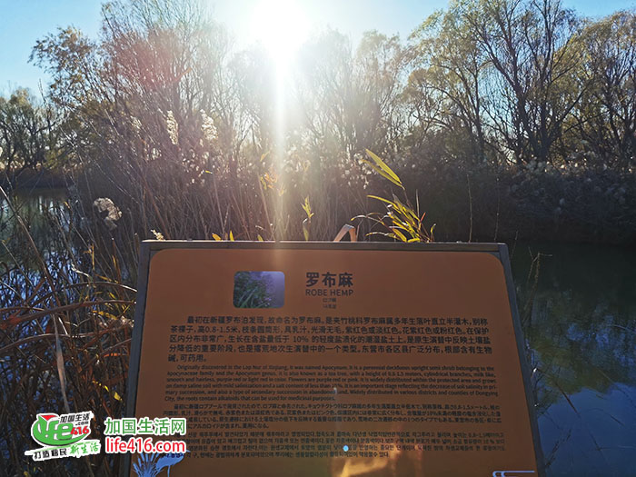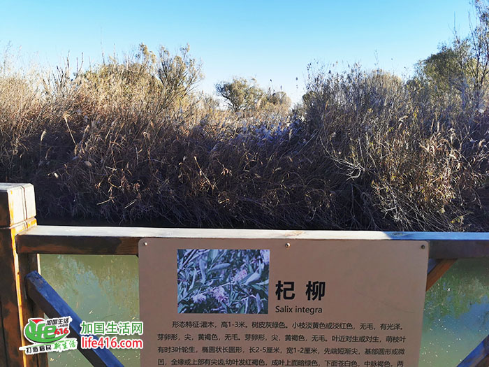 黄河故道天然柳林木栈道入口,长800米,木栈道上,可以一边观鸟赏鱼,一边品味曲径通幽的闲适,不时会看到鸿雁和斑头雁从身边游过。栈道周围傍水而生的高大植物群带就是天然柳林,种子从黄河上游冲刷下来,在这里落地生根、自然生长。