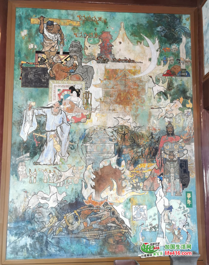 黄鹤楼楼顶的壁画里显示了黄鹤楼在1800年沧桑演变中屡次被损毁和被重建的历史,里面有6座黄鹤楼,你看出来了吗?
