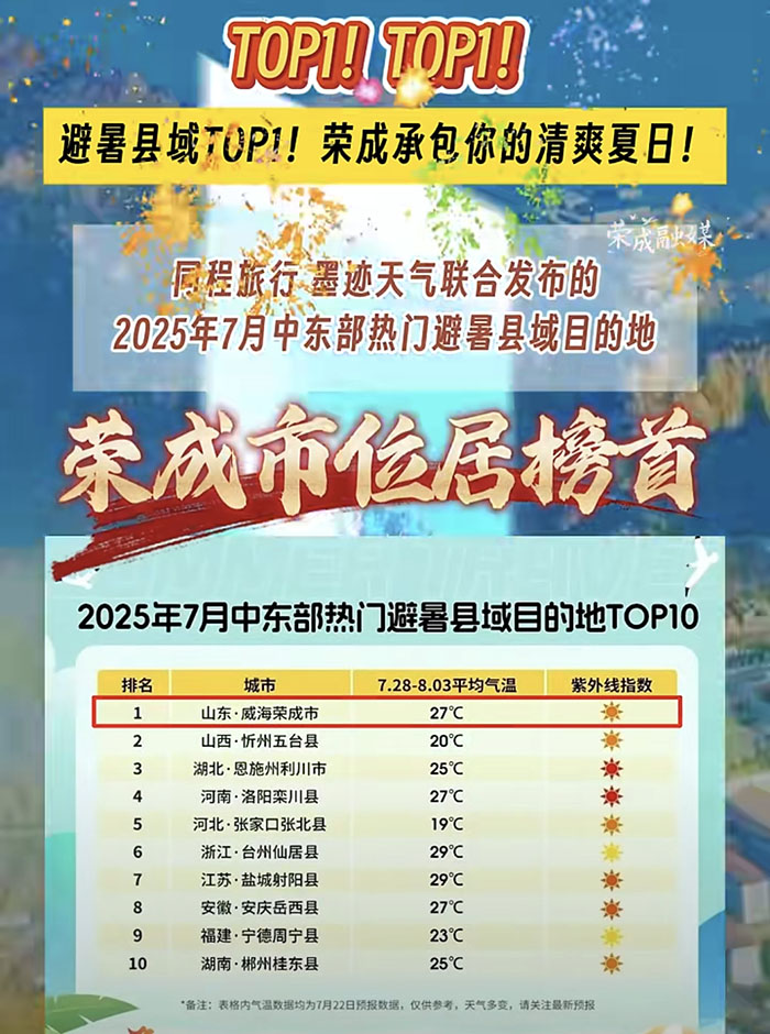 同程旅行联合墨迹天气发布2025年7月综合的旅行数据,以及中东部地区一周的气象数据,筛选出10个气候相对凉爽、旅行人气较旺的热门县域旅行目的地,荣成市位居榜首。