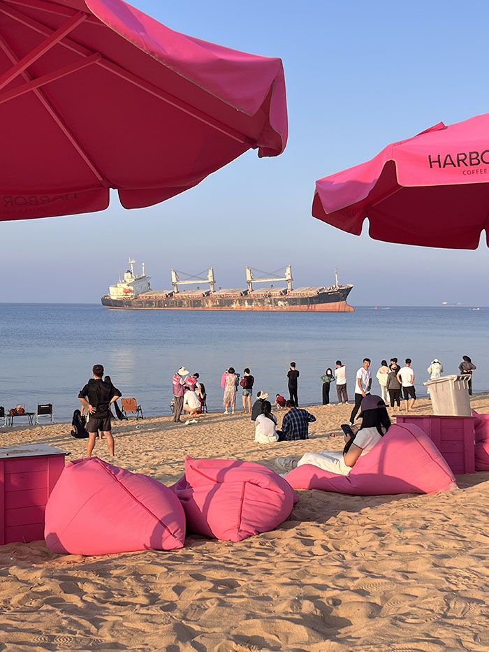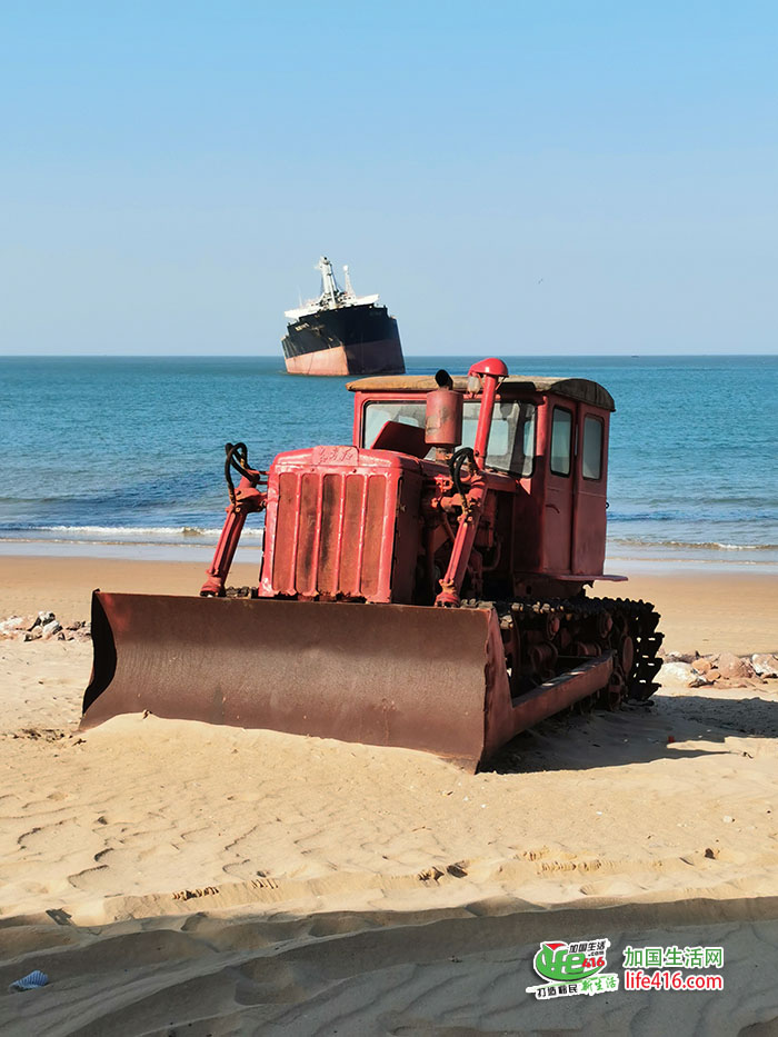 海滩上有各种造型的设施,配合人们在海滩打卡。人们的创意“爆棚”:既然船主不想拖了,那咱用拖拉机拖回家如何?