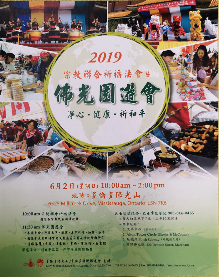 【加国生活网】多伦多佛光山和多伦多国际佛光会联合于2019年5月15日在万锦佛光缘举行新闻发布会,宣布“2019宗教联合祈福法会暨佛光园游会”将于6月2日在密西沙加市多伦多佛光山盛大举行,主办单位诚挚邀请社区朋友参加,支持素食、环保及文教慈善,共创健康和谐社会。
