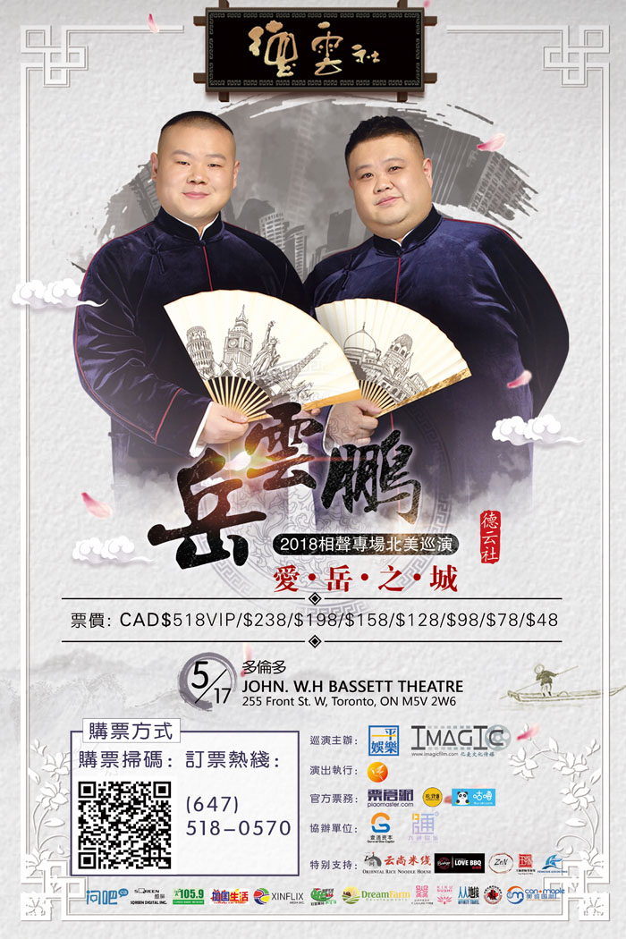 由郭德纲为首的“相声团伙”德云社,去年在Massey Hall 开了个相声大会, 而当时就有人问:“小岳岳怎么没来?”半年不到, 将在5月17日登陆多伦多开办相声专场《爱岳之城》,满足大家的心愿。这年头, 你就不可能不认识小岳岳, 他多栖发展, 上综艺《我们的挑战》,出演电影《从你的全世界路过》、《妖铃铃》,回到老本行照样当仁不让, 摘下喜剧综艺《欢乐喜剧人》冠军, 业务能力超强。距上一次小岳岳来多伦多已经过了6年,错过这次下一次不知又要等到何时,而且此次近距离的小剧场只有一千多张票, 现在不买可来不及后悔。