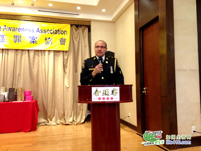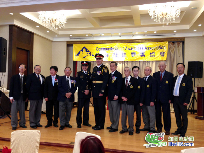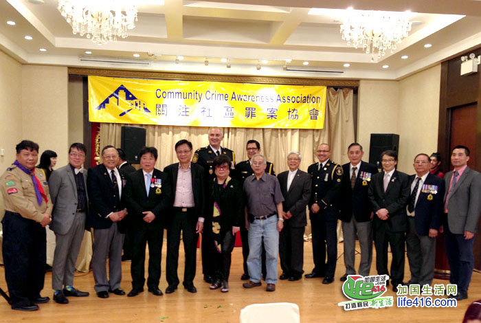 【加国生活网】为庆祝成立20周年,由前华裔警官苗延建担任会长的关注社区罪案协会(Community Crime Awareness Association,简称CCAA)于2017年6月4日星期日晚在万锦市万锦广场的金廷宴酒家举行了庆祝20周年晚宴,包括约克区警局副警察总长Dave Javis、Andre Crawford、多伦多市议员李振光、万锦市市议员何胡景、多伦多华人团体联合总会会长林性勇、东区华商会会长罗耀坤等嘉宾在内的300余人出席了此次晚宴。