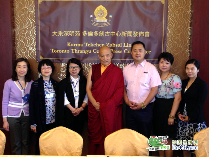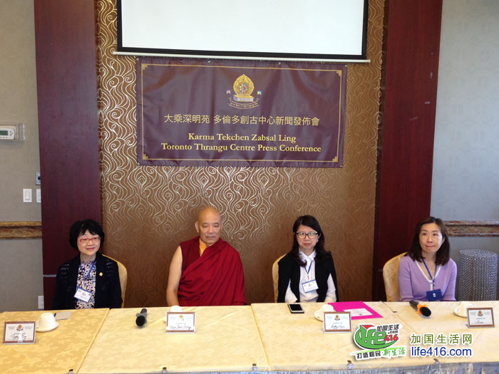 参加新闻发布会的有:多伦多创古中心的住持Lama Tashi Dondup, Abbot(左二)、中心董事Betty Lam(右二)、Polly Tong(左一)和Fiona Chen(右一)