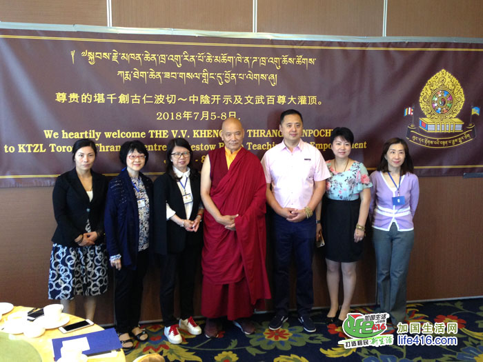 【加国生活网】由多伦多大乘深明苑创古中心主办、加拿大佛教文化促进会协办的“第九世堪千创古仁波切主持中阴开示及文武百尊大灌顶”新闻发布会于2018年6月19日在皇家御宴举行。参加新闻发布会的有:多伦多创古中心的住持Lama Tashi Dondup, Abbot、中心董事Betty Lam、Polly Tong和Fiona Chen(右一)。