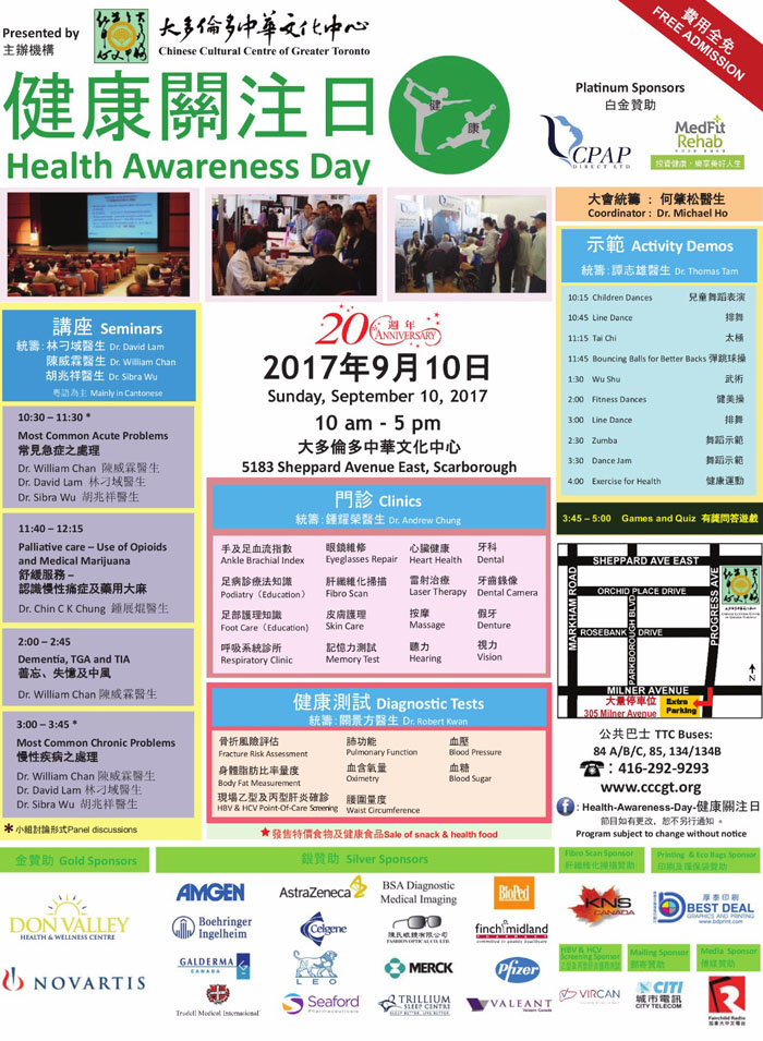【加国生活网】自1998年开始,因应华人社区需要而创办的大多伦多中华文化中心皇牌活动“健康关注日”,服务社区达二十年。2017年将于9月10日星期日10am-5pm在大多伦多文化中心(5183 Sheppard Ave. East, Scarborough)全面举行,欢迎各界人士踊跃参加,费用全免。