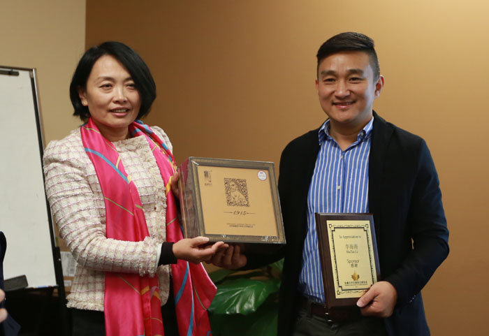 加拿大中文媒体记者协会会长朱枫杰(Jennifer Zhu)女士为李海涛先生颁发奖牌