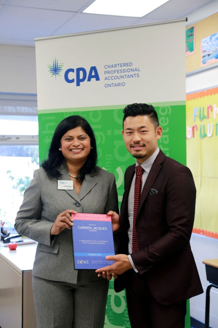 CPAC青年团团长胡添雨(右)为活动其中一场分场讲座的演讲嘉宾Carmen Jacques, Student Recruitment Manager of CPA Ontario(左)颁发感谢牌匾