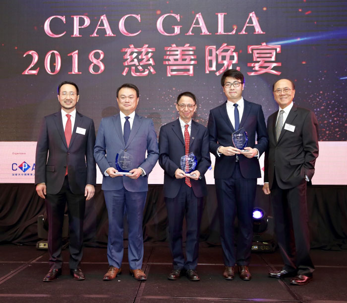 2018 CPAC“专业成就奖”与“青年成就奖”获奖者合影。左起:CPAC会长肖楚强(Eric Xiao)、2018 CPAC专业成就奖获奖者范伟铭(Alex Fan)、2018 CPAC专业成就奖获奖者吴建宏教授、2018 CPAC青年成就获得者史皓天(Harvey Shi)、 CPAC基金会会长林瑞铭(Richard Lim)