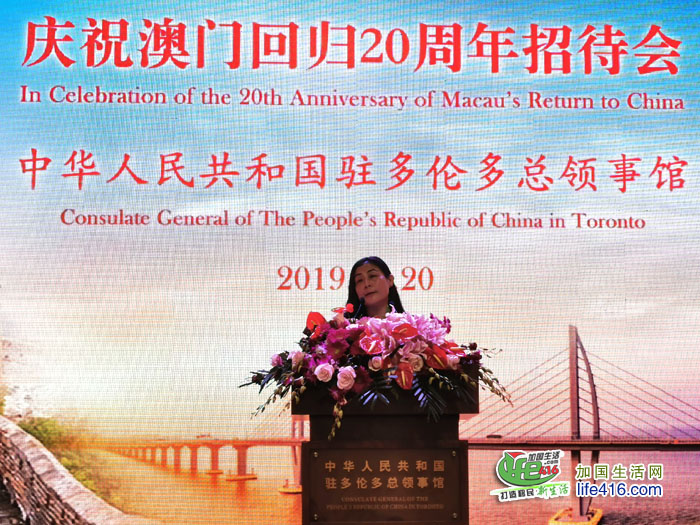 【加国生活网】中国驻多伦多总领事韩涛于2019年12月20日举行招待会,庆祝澳门回归祖国20周年。加拿大联邦参议员胡子修、多伦多市市议员詹嘉礼(Jim Karygiannis)、万锦市市议员杨绮清、列治文山市市议员陈志辉,前联邦众议员谭耕、前安大略省国际贸易厅厅长陈国治等加三级政府代表,塞尔维亚、孟加拉国驻多伦多总领事等驻多领团代表,香港驻多伦多经济贸易办事处处长巫菀菁,多伦多澳门会会长袁小虹,领区华侨华人、中资机构、留学生代表及当地各界人士400余人出席。