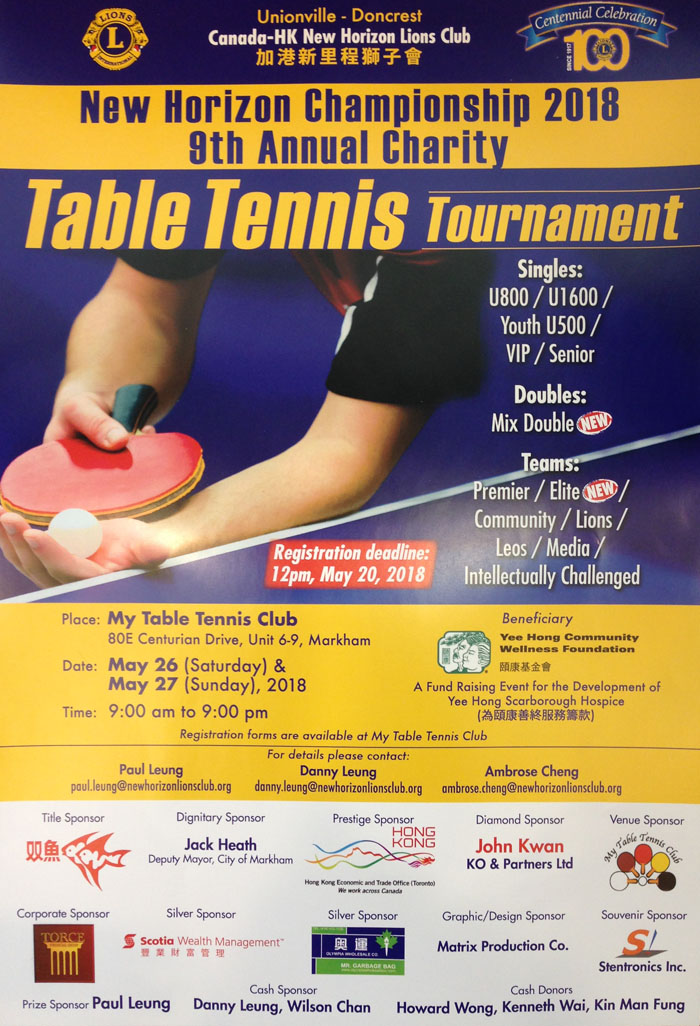 【加国生活网】加港新里程狮子会于2018年4月3日举行新闻发布会,宣布2018第九届慈善乒乓球锦标赛将于5月26及27日在万锦市举行,交流球技之余亦可做慈事,欢迎各界人士踊跃参加。