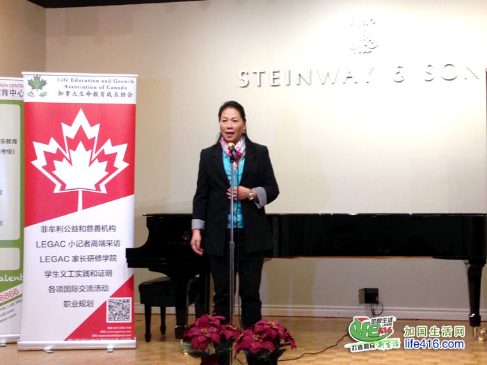 加拿大生命教育成长协会会长、LEGAC国际艺术文化交流中心主席、全球杰出华人艺术家协会加拿大分会理事、全球杰出少年演奏家选拔赛执行总监Tina Tao向各界来宾介绍音乐节及相关协会未来的发展目标。她提倡:教育是要带领每个家庭成员融入到实践和社会公益发展当中来,要让每个学生知道个人价值和社会价值的对接点,要在实践和社会发展中发现自己的亮点和光芒,建立自己的人生规划和目标。
