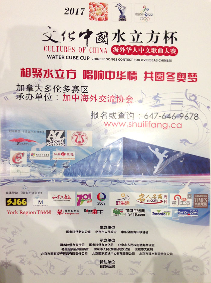 【加国生活网】由国务院侨务办公室、北京市人民政府、中华全国青年联合会,加中海外交流协会承办加拿大多伦多赛区“2017年文化中国水立方杯海外华人中文歌曲大赛”,现正接受报名,今年的比赛分设青少年组和成人组,优胜者将代表加拿大多伦多赛区到北京参与总决赛。