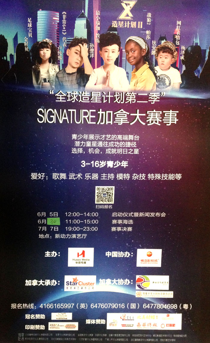 2018全球造星计划”加拿大赛区分海选和决赛,凡年龄在3-16岁之间的青少年儿童,具备唱歌,跳舞,乐器,话剧,音乐剧,主持,以及其他特殊才艺中的任何一种,都可以报名参加海选,最后选出二十个节目进入决赛,具体的比赛时间地点以及报名方式如下: