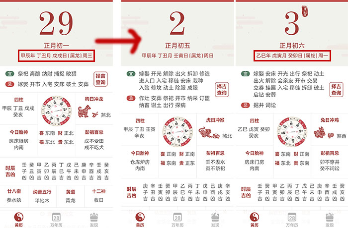 按理说正月初一代表着中国农历新年的开始,但如果你查黄历,会发现初一到还初五都还是甲辰年,直到初六(2025年2月3日)才正式进入乙巳年。换句话说,今年大年初一到初五出生的宝宝还是属龙的,而不是属蛇的哟。