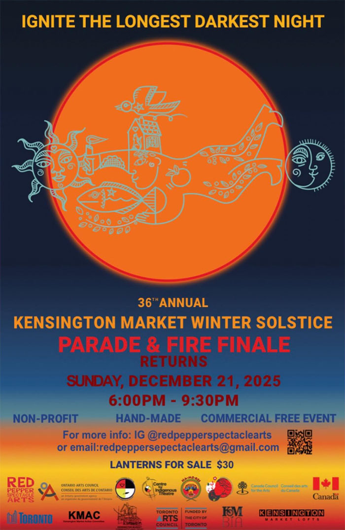 【加国生活网】每年的Kensington Market Winter Solstice都会在12月21日举行,2025年第36届Kensington Market Winter Solstice也同样定在12月21日举行,晚上6点至9点半有“重头戏”——灯火节大游行。届时,你会发现Kensington Market到处都是灯与火的世界,游行队伍也是盛妆出席啊:踩高跷的小丑、拿着蜡烛的木偶以及火焰表演等等,到处都是光亮如昼的。