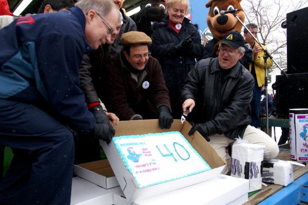 狂欢节的开幕式,大家一起切庆祝周年的大蛋糕(图片来源:www.wintercarnival.net)