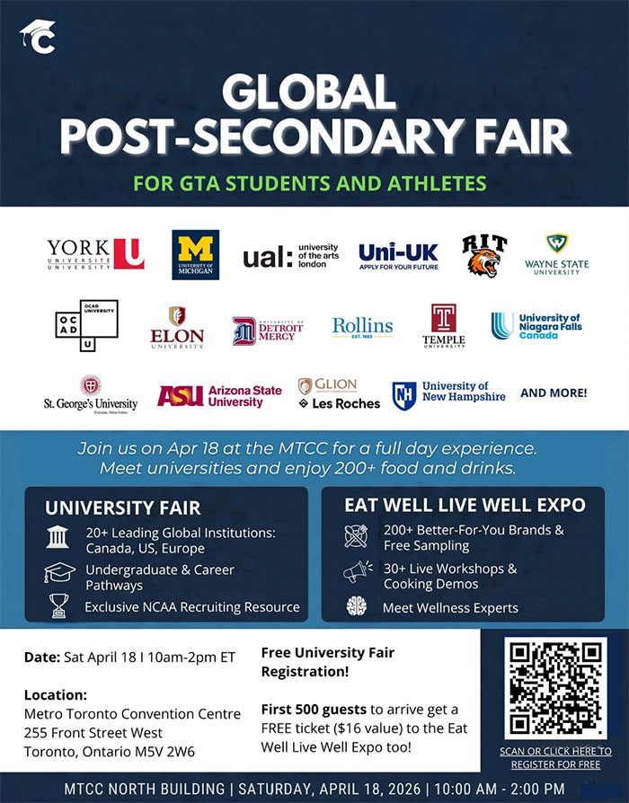 【加国生活网】Global Post-Secondary Fair 将于本周六在多伦多会议中心举行,这是一个专为高中生、家长与升学顾问打造的国际高等教育展,现场汇集来自加拿大及海外多所大学的招生代表,提供最直接的一手升学资讯。参展者可以与大学面对面交流,了解各校最受欢迎的本科专业、入学要求、申请流程、校园生活,以及未来职业路径,包括医疗健康、法律、商科、工程等热门方向。展会也特别强调奖学金与助学金资讯,学生可向学校代表询问入学奖学金、国际学生资助及申请技巧。同时,展会还提供各校体育项目介绍,让有运动特长的学生了解校队资源、训练设施与学生运动员支持服务。对于正在规划大学申请、比较不同国家升学路径、或希望一次性掌握最新招生趋势的家庭来说,这是一个非常高效的一站式升学平台。需要注意的是该展会需提前线上注册,入场免费。