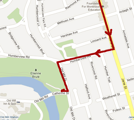 想看Humber River里的三文鱼,一定要到Etienne Brule Park,这个公园位于Bloor Street West 和Jane 的西北角,不太好找。沿着Jane 街有一条Humverview Rd.,路名很小也很窄,很容易就错过了。如果你是沿着Jane 从北向南开的话,在Humverview Rd 向右拐,然后一直向前开,中间经过一个十字路口,再继续向前开,之后会看到有个岔路口,还有个禁向左拐的标志。由于需要向左拐进Old Mill Dr.,因此小编稍微向前又开了一小段,然后掉头回转,重新拐回了Old Mill Dr.,之后在Catherine Rd. 再右拐,也就前方10米左右的距离,就可以看到公园名Etienne Brule Park 和一个停车场。停车场的左手边就是Humber River。