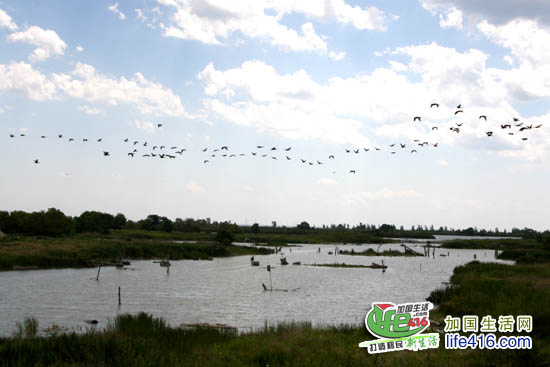 停留在这里的鸟儿好象把这里当做了一个学习飞翔的“训练营”,集体从一个方向飞行,分散分回,再重新组队朝同一方向飞行。因此,你不用担心看不到鸟儿排着队型的壮观场面。