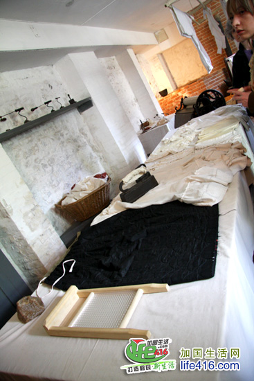 当时的佣人们把衣服或床单洗干净后,晒干或烘干,然后再用熨斗熨好。遇到那些大床单,她们就用后面那种带圆轱辘的机器来弄平床单,省得一点点熨,很费时费力的。