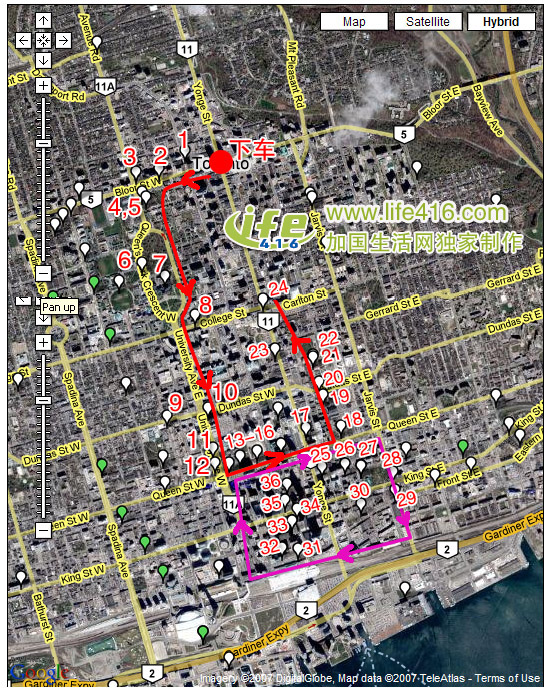 从Yonge & Bloor地铁站下车后,沿着Bloor街向西,沿途有3个景点-----到了University Ave. 后再向南,沿途有9个景点 ------- 到了Queen St. 向东,沿途有5个景点 ---- 向东一直走到Bond St.,再向北,沿途有7个景点 ------ 最后到Yonge街上的College地铁站坐车回家。根据我所画的红色线路图,依次参观这些景色吧。