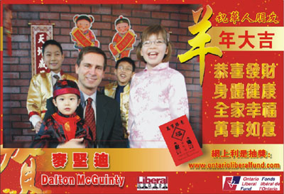 安省执政党是自由党,省长叫Dalton McGuinty,中文名叫麦坚迪(这是他的官方中文名字,不知是谁给他起的,还挺不错的。)他是2003年10月23日就任安省省长的,是第24任省长。2003年麦坚迪在竞选省长期间,我还有幸为他设计过华人报纸的宣传广告呢(中间的就是麦坚迪,看上去很帅吧)。
